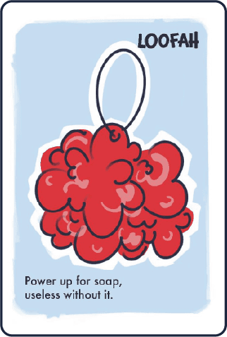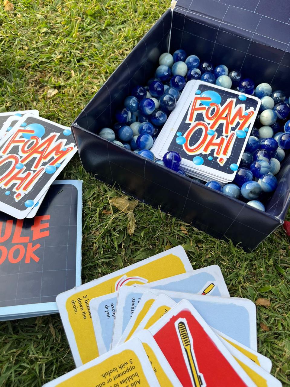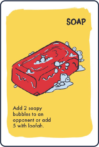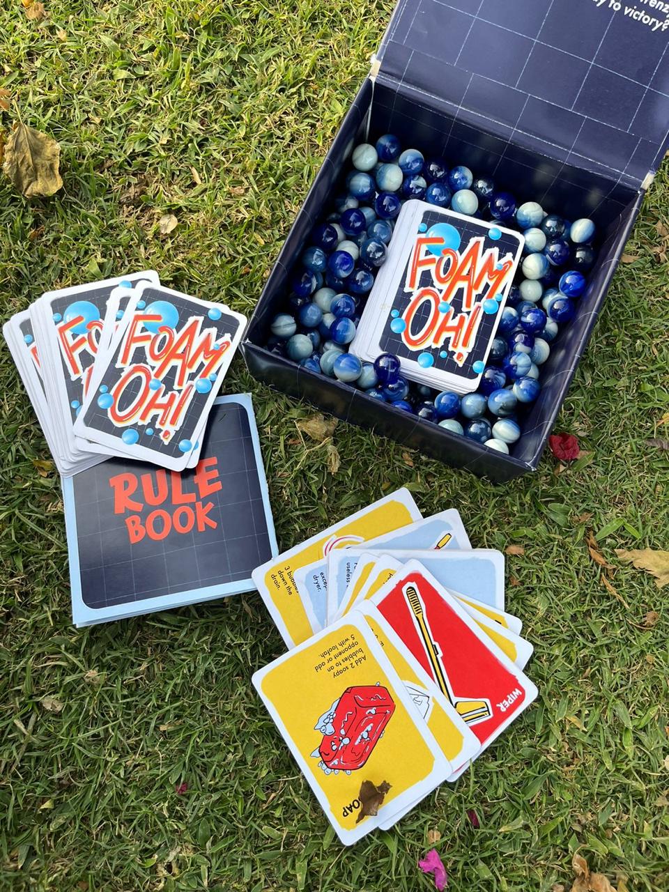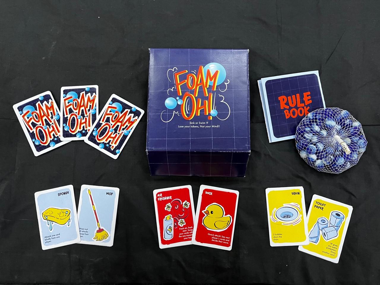 Foam-Oh! is a fast-paced card game where players must lose all their bubble tokens to escape a foam-filled bathroom, using cards based on everyday bathroom items to sabotage opponents while reducing their own bubbles.